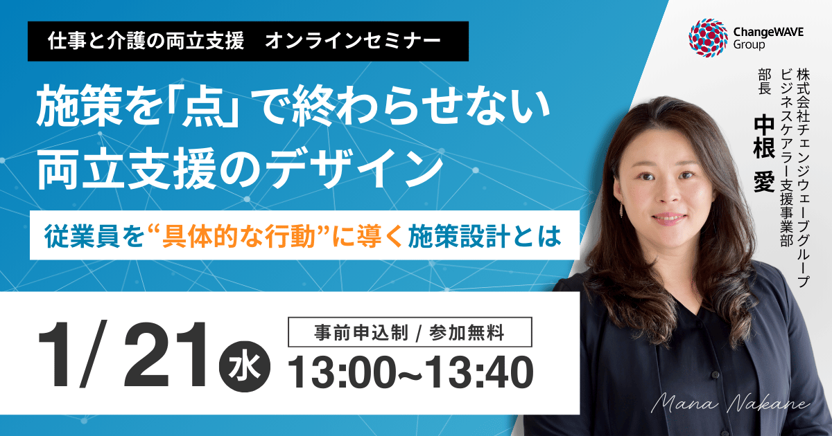 2025年4月から育児・介護休業法が改正施行され、 仕事と介護の両立支援が一層重要視されるようになりました。 一方で、制度整備や法改正への対応は進んだものの 弊社が運営する人事ご担当者の勉強会では 「実態が見えない」「対象者に届いているのか不安」といった課題も聞かれます。 特に介護が始まっていない“未介護層”に対しては、 「無関心に見える」「声が上がってこない」などのお悩みが少なくありません。 本セミナーでは、 両立支援に取り組む企業と、年400件以上の相談を受けてきた専門家による事例から、 「現場のニーズ」に即した両立支援設計のポイントをお伝えします。